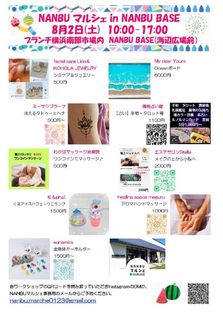 日程:8/2(土)10:00〜17:00場所:ブランチ横浜南部市場内 NANBU BASE(海辺広場前) (〒236-0002神奈川県横浜市金沢区鳥浜町1-1) ※駐車場はあります!